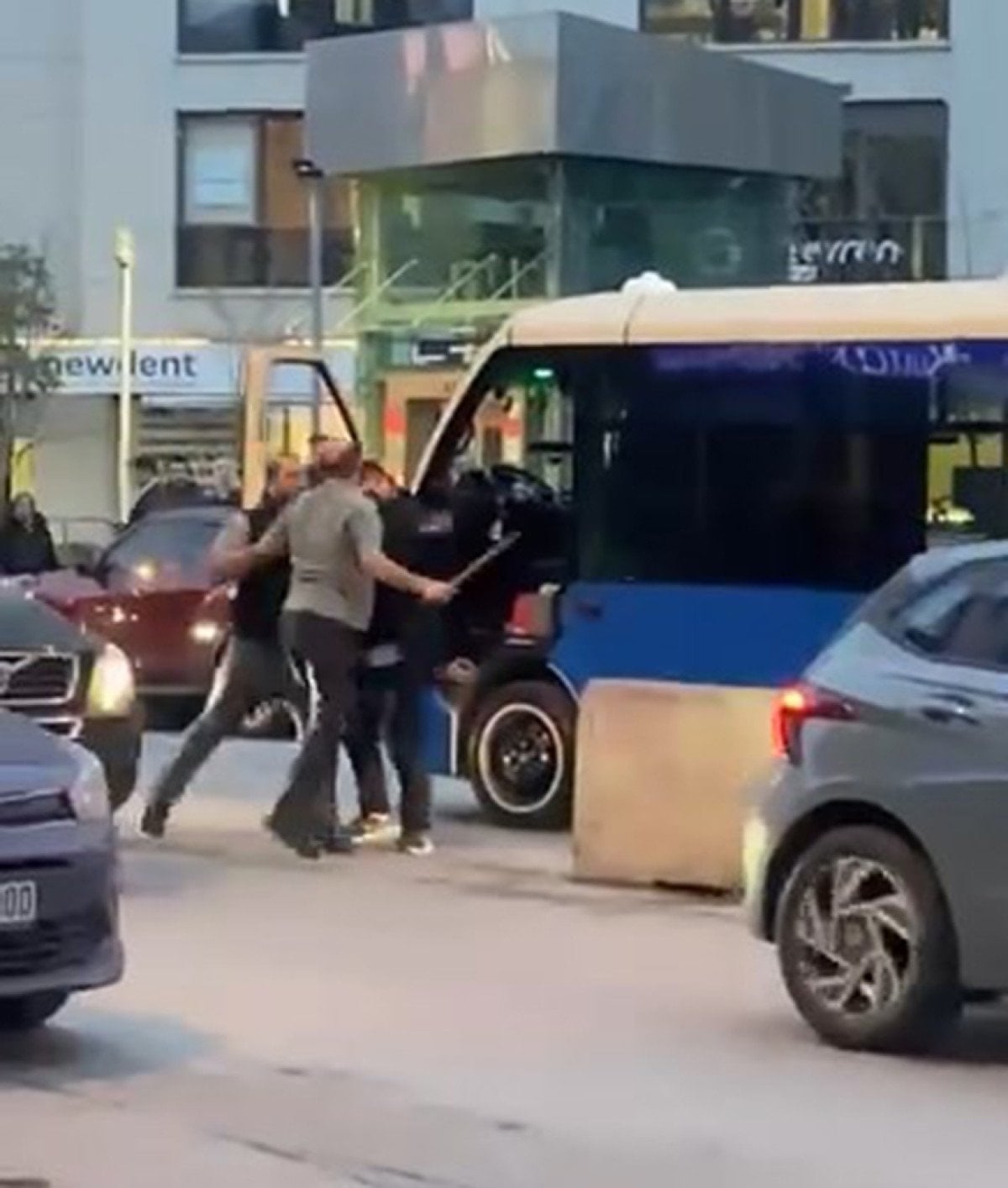 Hafif ticari araç sürücüsünün minibüs şoförüne sopayla saldırdığı anlar cep telefonuyla kayda alındı.
