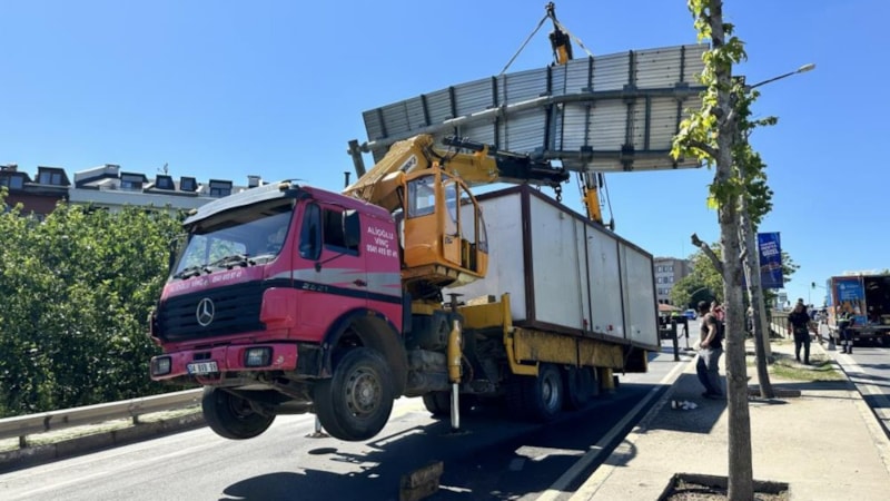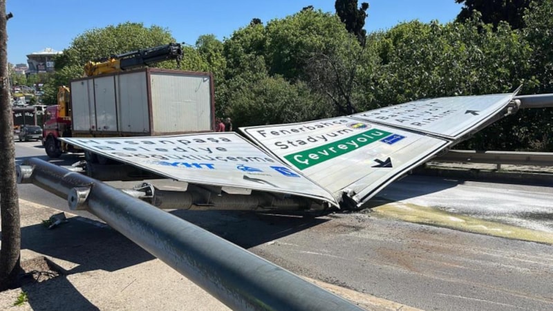 İstanbul Kadıköy'de konteyner yüklü vinç, seyir halindeyken yönlendirme levhasına takıldı. Olayda yaralanan olmazken vinçte ve levhada maddi hasar oluştu.