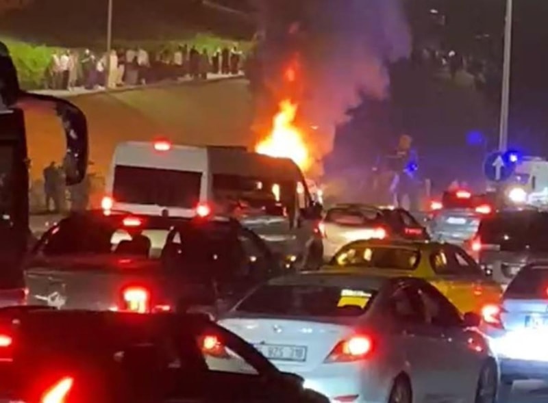 Kaza yapan aracın alevler içinde kaldığı anlar cep telefonu kamerasıyla kaydedildi.