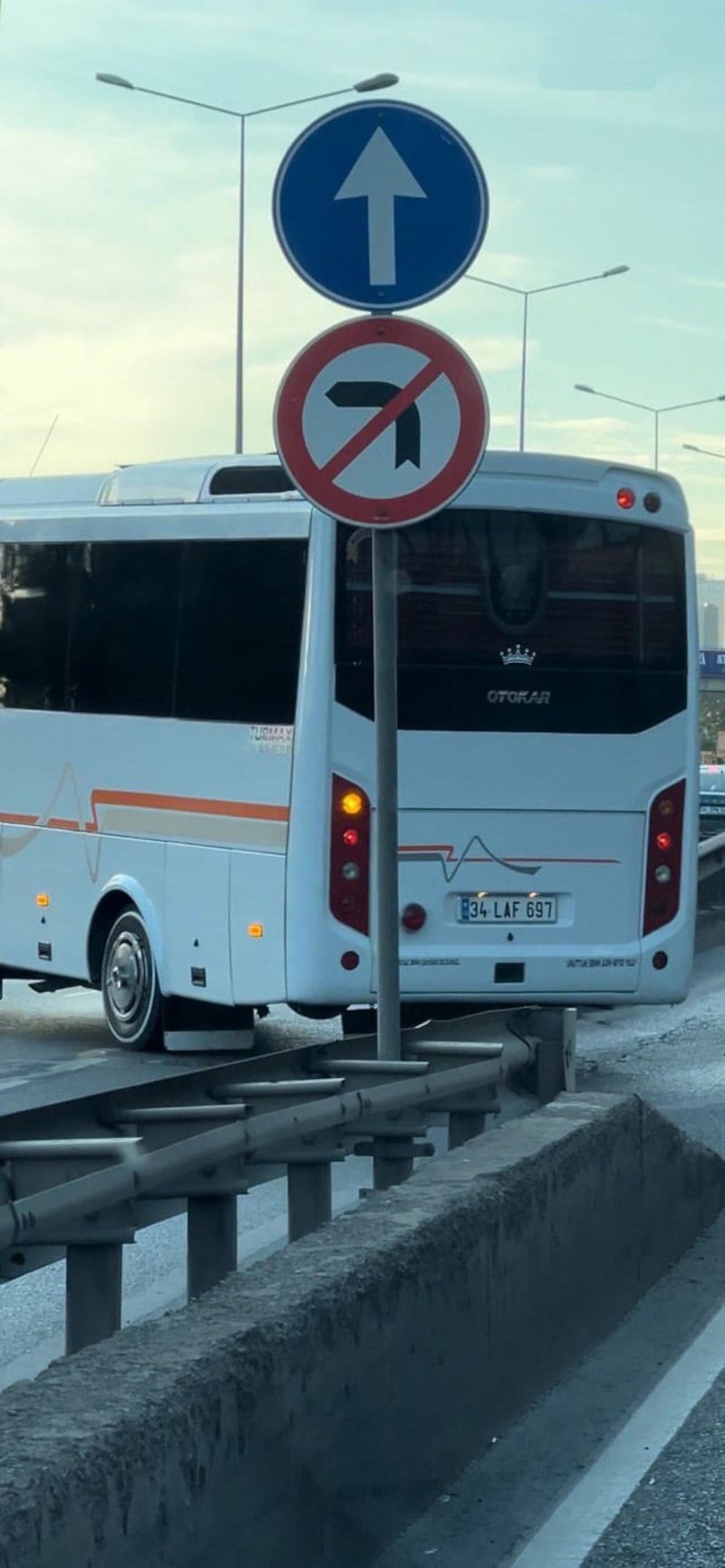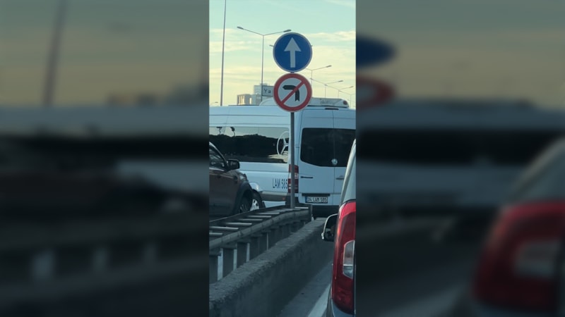 İstanbul'un Kartal ilçesi D-100 kara yolu yan yolunda seyreden servis minibüsü sürücüleri trafiği atlatmak uğruna diğer sürücüleri ve trafiği tehlikeye atarak yasak tabelasını görmelerine rağmen yan yoldan kara yoluna girmek için sola geçti.