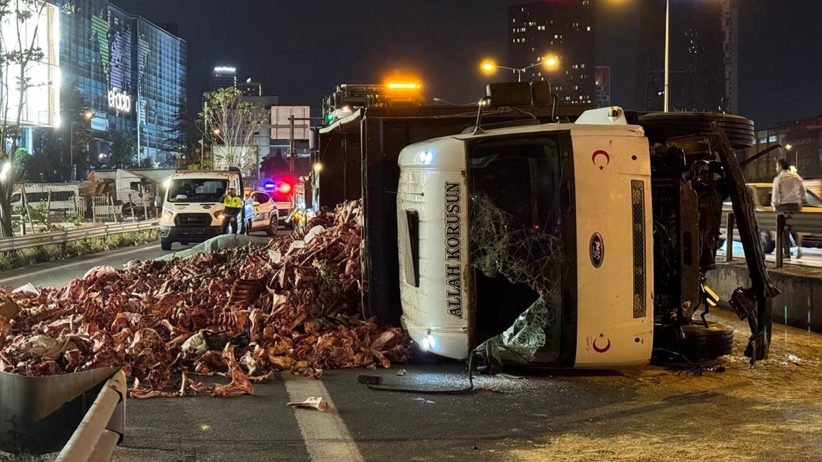 İstanbul'un Küçükçekmece ilçesi Mehmet Akif Mahallesi Atatürk Bulvarı'nde bariyerlere çarpan kamyon yaklaşık 20 metre sürüklenip devrildi.