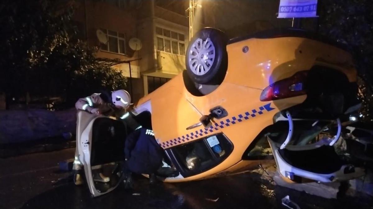 İstanbul'un Maltepe ilçesi Gülsuyu Mahallesi'nde Emre Açık hakimiyetindeki ticari taksi önce elektrik panosuna çarptı, ardından da takla atarak durabildi.