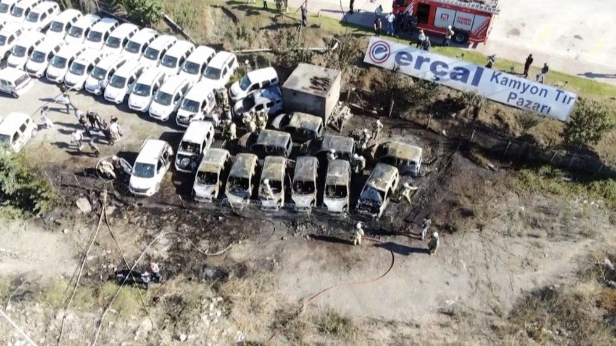 DHA'nın haberine göre öte yandan, yanan araçlar havadan drone ile görüntülendi.
