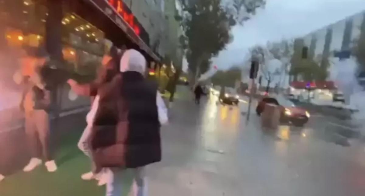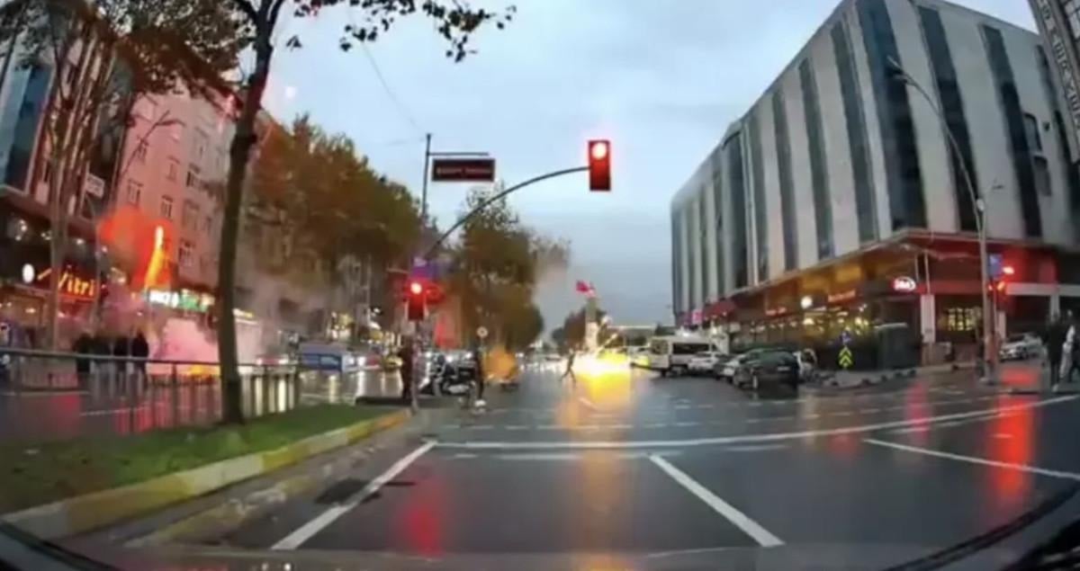 Caddede havai fişeklerin patlatılması sonrasında çevredeki vatandaşların ve caddeden geçen motosiklet sürücüsünün panikle kaçışması görüntülere yansıdı.