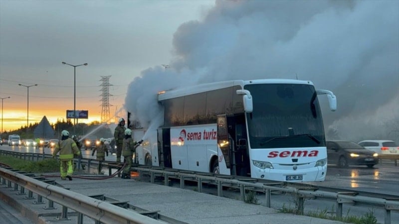 Yangını fark eden otobüs şoförü, aracı yol kenarına çekerek durumu itfaiye ekiplerine haber verdi.