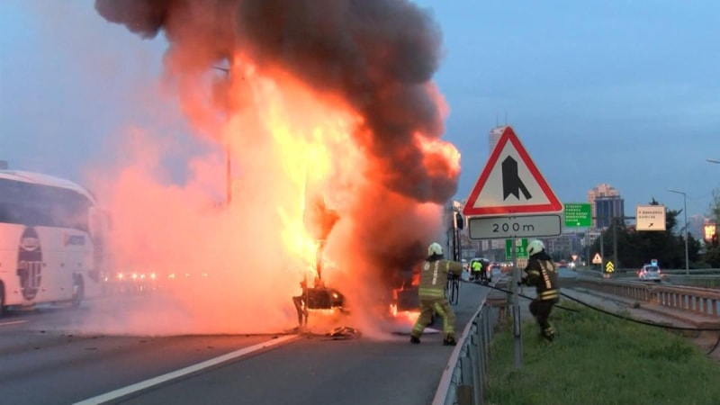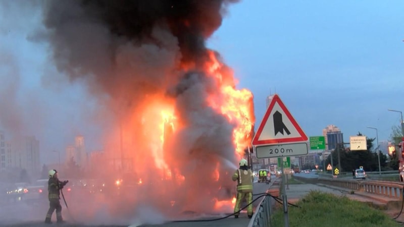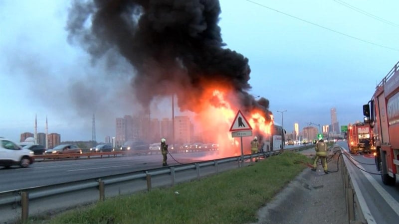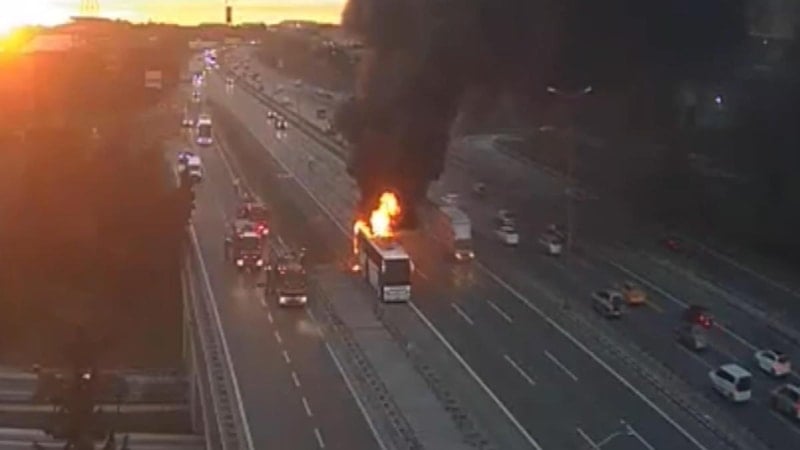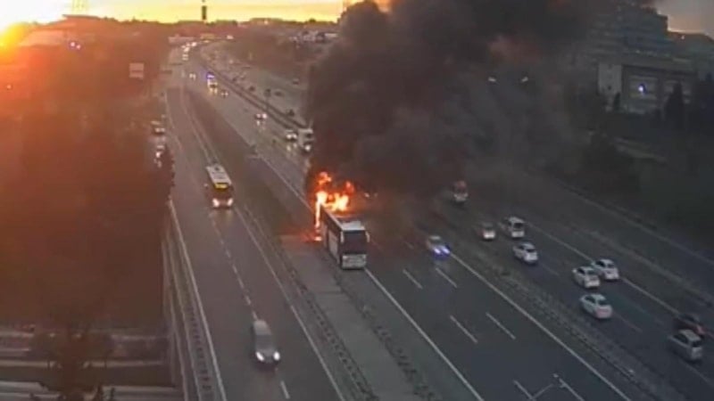 Ümraniye, TEM Otoyolu'nda seyir halinde olan yolcu otobüsünde yangın çıkarken, alev alev yanan otobüse itfaiye ekipleri müdahale etti.