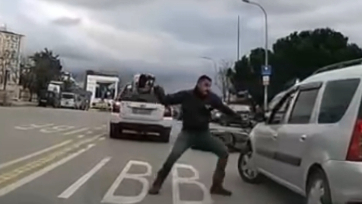 - Motosikletli, kaskla otomobile saldırırken, sürücüler arasındaki kavga başka bir araç kamerasıyla kaydedildi.