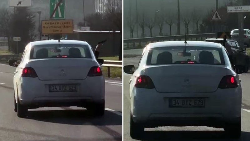 İstanbul'da izleyenlere "pes" dedirtecek bir görüntü daha kayda geçti. Seyir halindeki aracın yolcu koltuğunda oturan bir şahıs, elindeki silahı çıkardığı camdan sallayarak yolculuk yaptı.