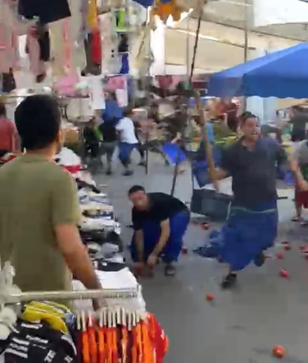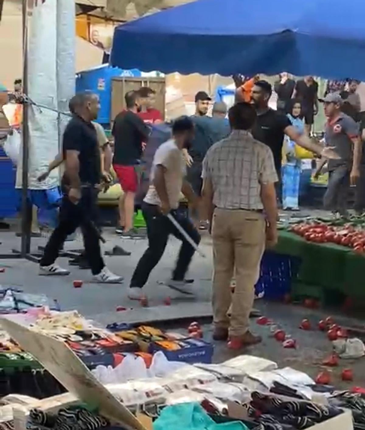 Taraflar birbirlerine sopa, tekme ve yumruklarla saldırırken birbirlerinin tezgahını yıkarak ürünlerini yere dökmeye çalıştı.