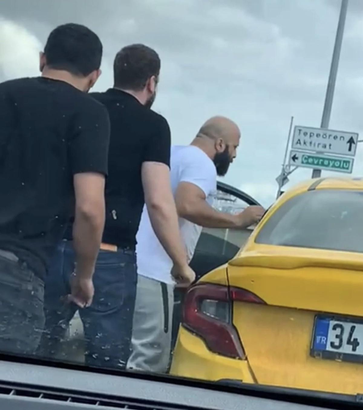 Taksi şoförünün üzerine yürüyen grubun, sürücüyü arabasına doğru yumruklayarak sürüklediği, araca zorla bindirdiği, aracın kapısını defalarca çarptığı ve aracı yumruklarken küfür ettiği görüntülere yansıdı.