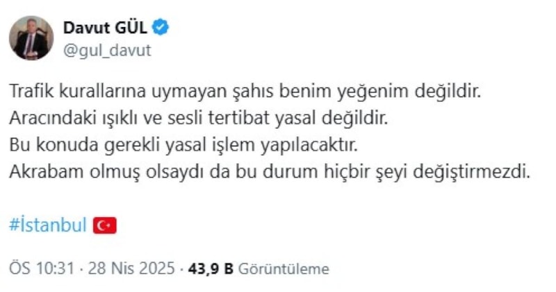 Trafik kurallarına uymayan şahıs benim yeğenim değildir. Aracındaki ışıklı ve sesli tertibat yasal değildir. Bu konuda gerekli yasal işlem yapılacaktır. Akrabam olmuş olsaydı da bu durum hiçbir şeyi değiştirmezdi.