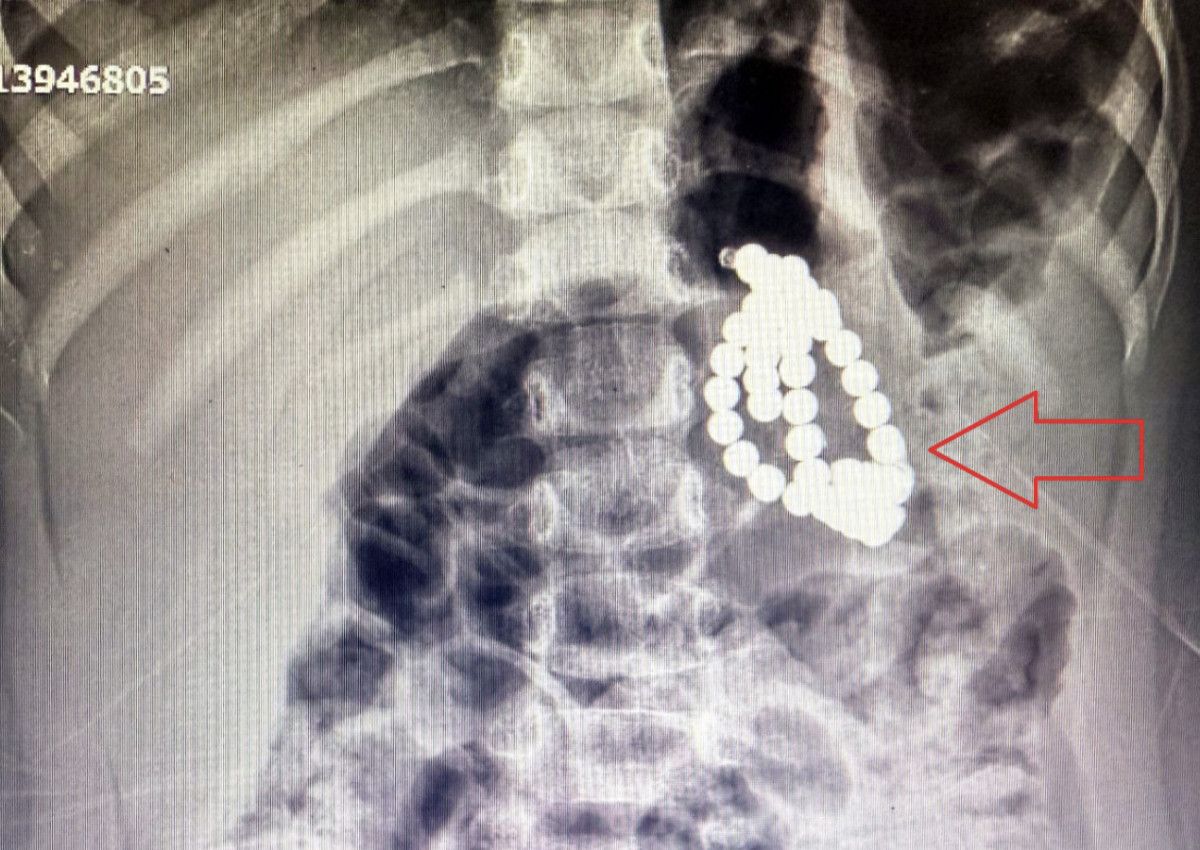 10 gün önce yine kusma şikayetleri başladı. Buraya getirdik, röntgen çektiler. Gördüğümüzde şoke olduk. Kolye, bileklik gibi boncuklar vardı. Biz önce ablasının kolyesini, bilekliğini yuttu sandık. İlaç verilerek dışkıyla atılacağı yönünde takip kararı verildi önce. Ancak takipler sırasında cisimlerin yerinden hareket etmediği tespit edilince, bir program vasıtasıyla bunların manyetik mıknatıs olduğu tespit edildi.