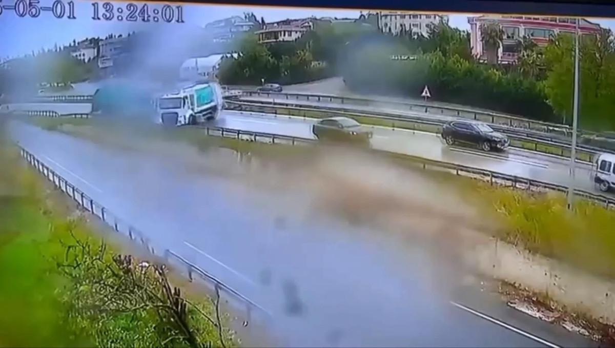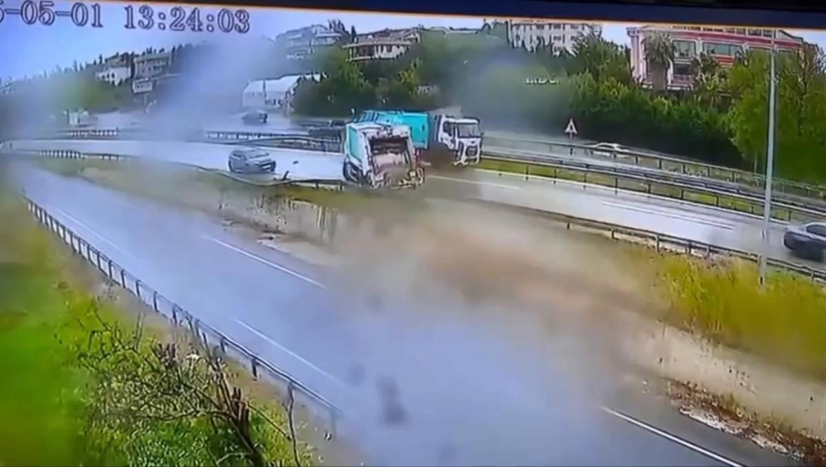 Kaza nedeniyle yavaşlayan trafikte, sürücüsünün direksiyon hakimiyetini kaybettiği bir çöp kamyonu da yol kenarındaki bariyere çarptıktan sonra kendi etrafında dönerek, arkasından gelen başka bir çöp kamyonuna çarptı.