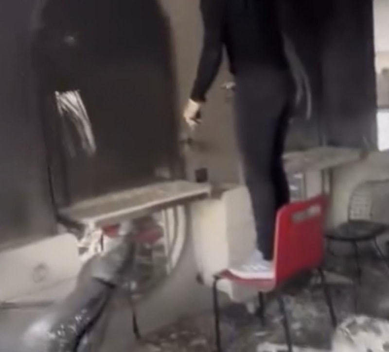 2 şahıs motosikletle geliyor, kaskları var yüzlerinde maskeleri var. Biri kadın biri erkek, kamerada da belli oluyor. Aşağıdan kapıyı omuzla ittirerek açıyorlar ama yukarıdaki kapıyı kilit olduğu için açamıyorlar. Benzini kapının arasından döküyor; ondan sonra kaçıp gidiyorlar.