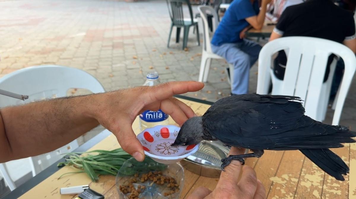 Çorman, kargayı elleriyle beslerken, o anlar bir vatandaşın cep telefonu kamerasına yansıdı.