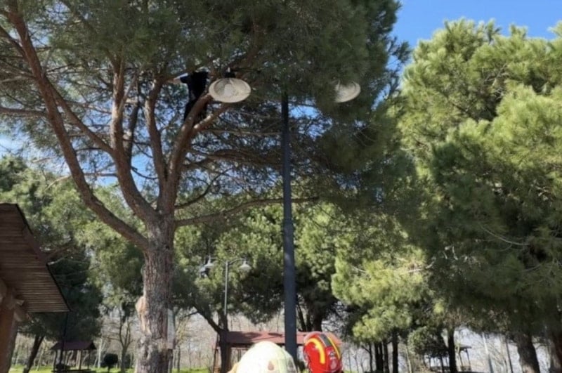 İtfaiye ekipleri, yanlarında getirdikleri merdiveni ağaca dayayarak Gürses’in güvenli bir şekilde inmesini sağladı.