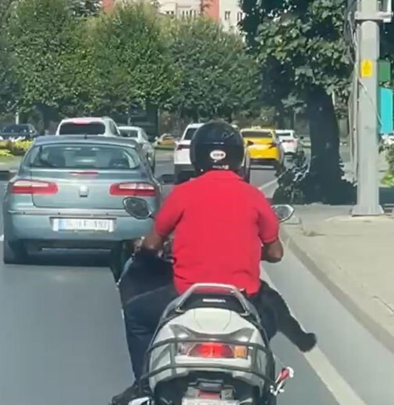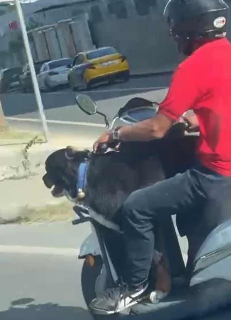 Bakırköy Ataköy Sahil Yolu’nda bir motosiklet sürücüsünün, önüne aldığı köpekle tehlikeli şekilde ilerlemesi bir vatandaşın cep telefonu kamerasına yansıdı. Hem sürücünün hem de hayvanın hayatını riske atan o anlar, çevrede büyük şaşkınlık yarattı.