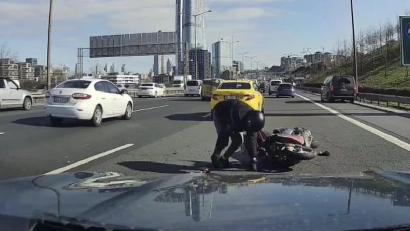 Panikle yerden kalkan motosiklet sürücüsü, güvenli bir alana geçmek için hızla emniyet şeridine gitti.