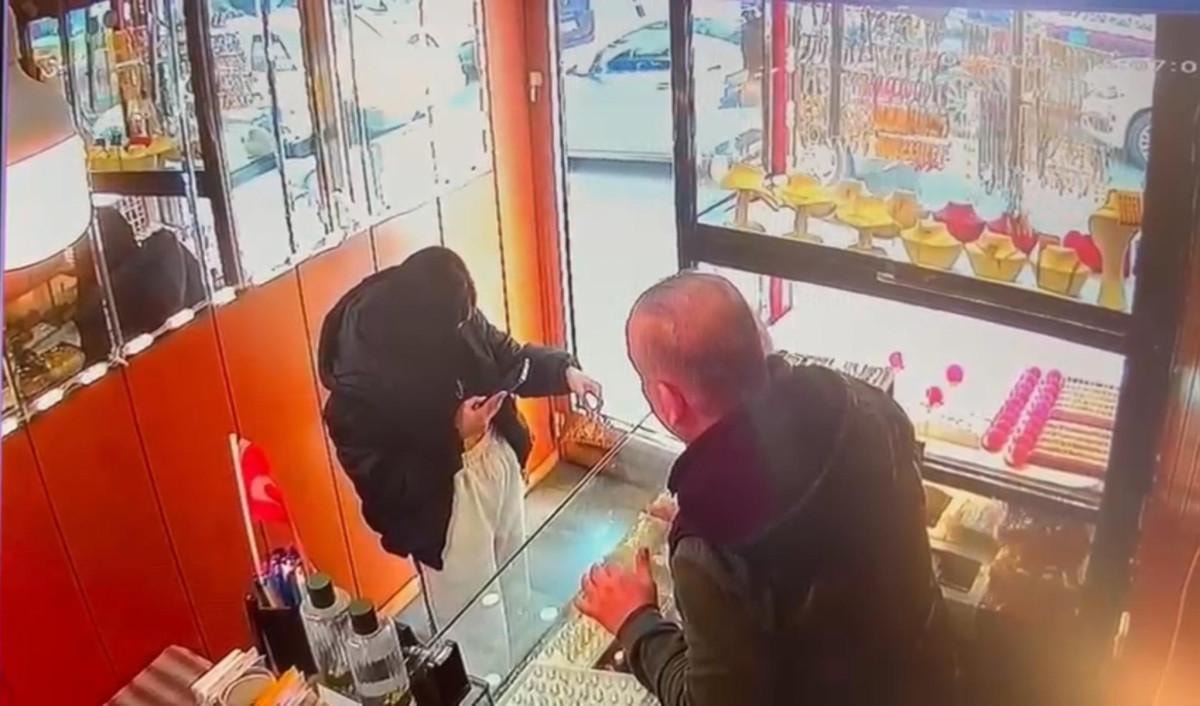 Kuyumcudan altın tacı isteyen kadın, cep telefonuyla birçok kez fotoğrafını çektikten sonra tacı çalıp kaçtı.