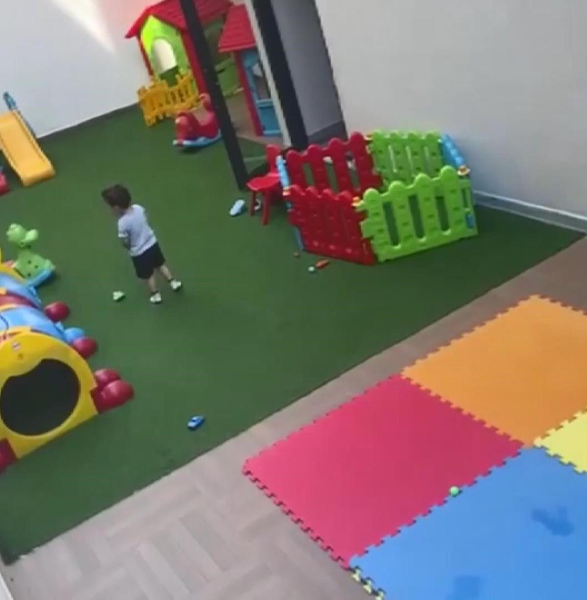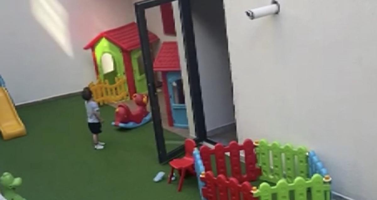 Görüntülerde, çocuğun okulun bahçesinde tek başına kalıp bir süre ağladığı, o esnada görüntüleri çeken kişinin, "Burası özel bir kreş, çocuk 2 saattir ağlıyor, hiçbir yetkili, hiçbir görevli gelip de ilgilenmiyor. Bu kreşin ismini alarak görüntüleri sosyal medyada yayınlayacağım. Lütfen çocuklarınızı verdiğiniz kreşleri, özenle seçerek verin, yoksa bütün gün bu şekil ağlıyor çocuklar. İlgilenen hiçbir görevli yok" şeklinde ifadeler kullandığı, o sırada da çocuğun oyun masasını duvar kenarına getirip üstüne çıktıktan sonra kadından yardım istediği anlar görülüyor.