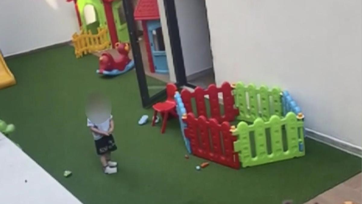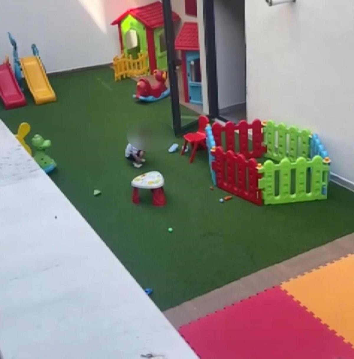 2.5 yaşında olduğu öğrenilen çocuğun anaokulu bahçesinde tek başına kaldığı anlar cep telefonu kamerasına yansıdı. Görüntülerde çocuğun 'Anne' diyerek ağladığı ve bağırdığı anlar görülüyor.