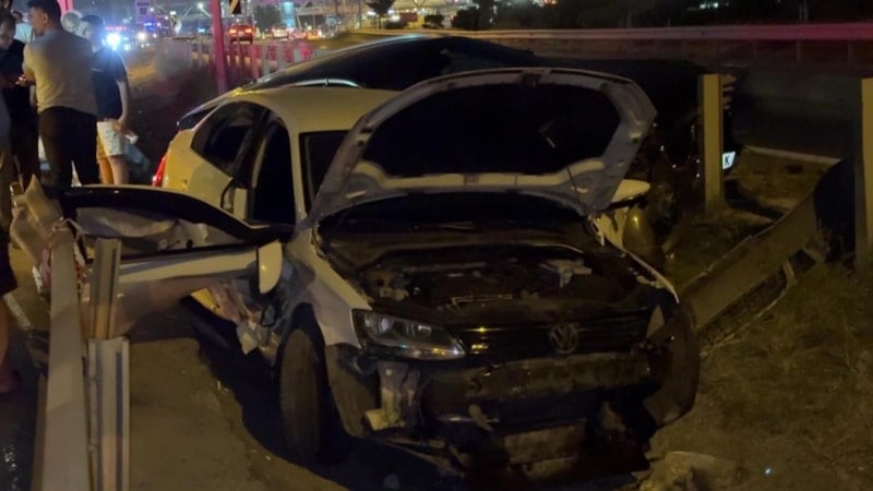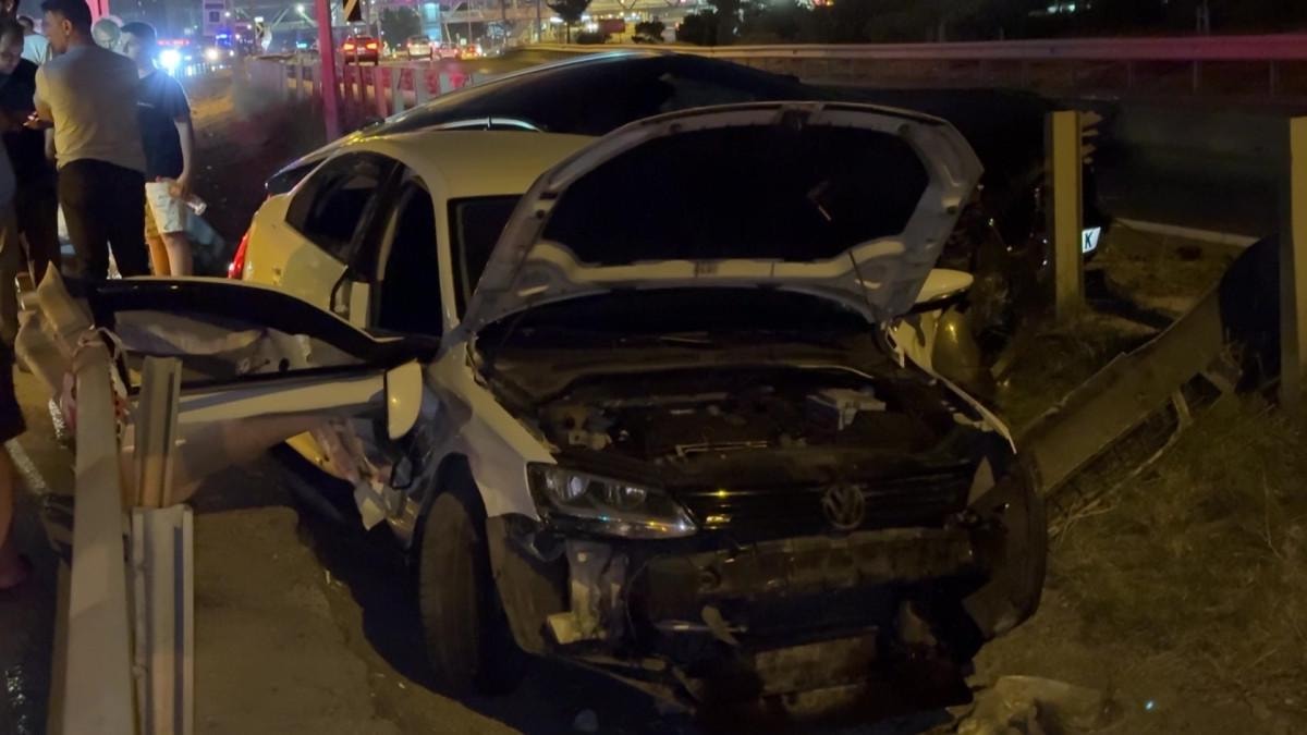 Çarpışma sonrası iki otomobil de bariyerlere çarparak yol ayrımındaki boşluğa düştü.