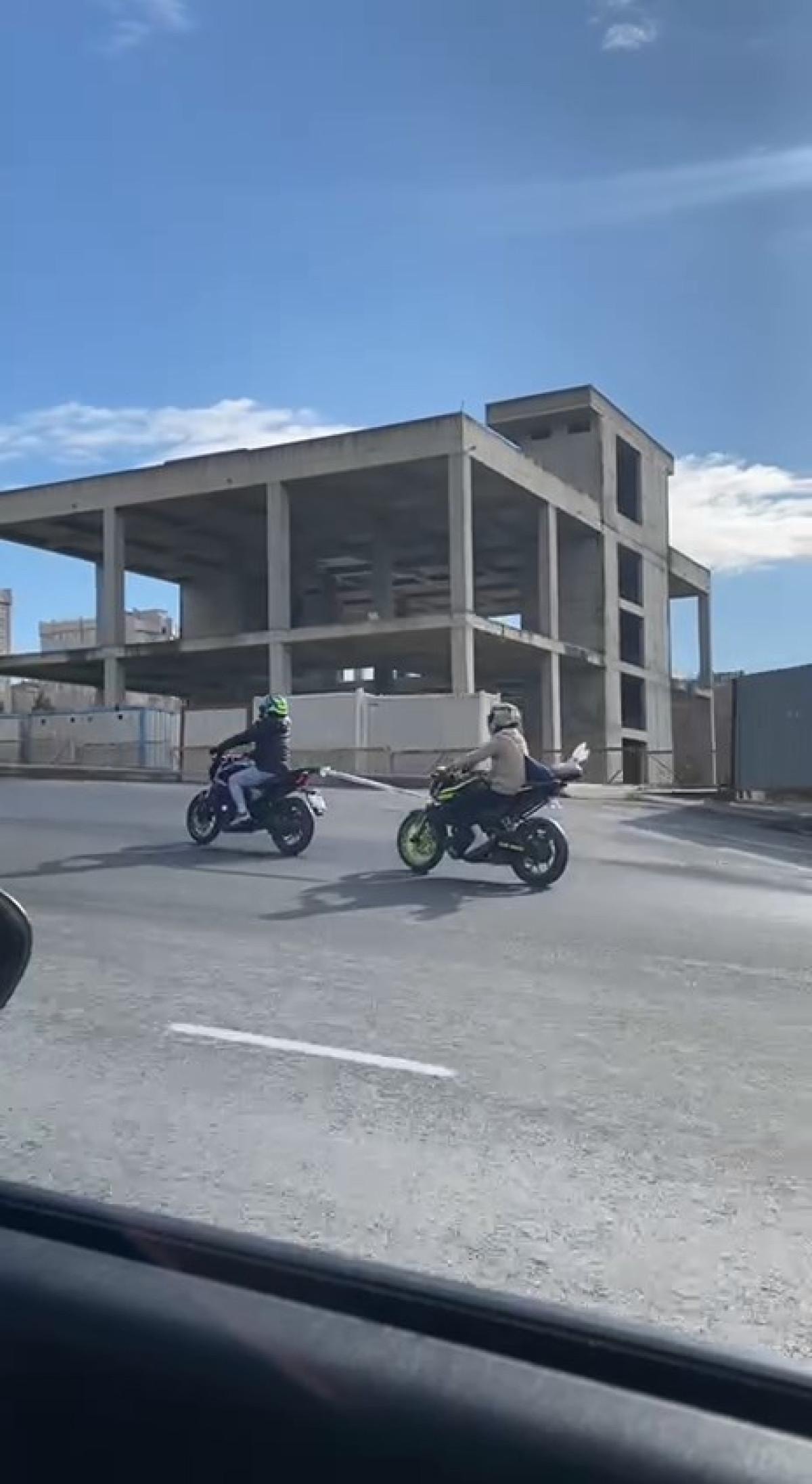 Öndeki motosiklet sürücüsü arızalanan motosikletle arasına plastik poşet bağlayarak trafikte uzun süre bu şekilde ilerledi.