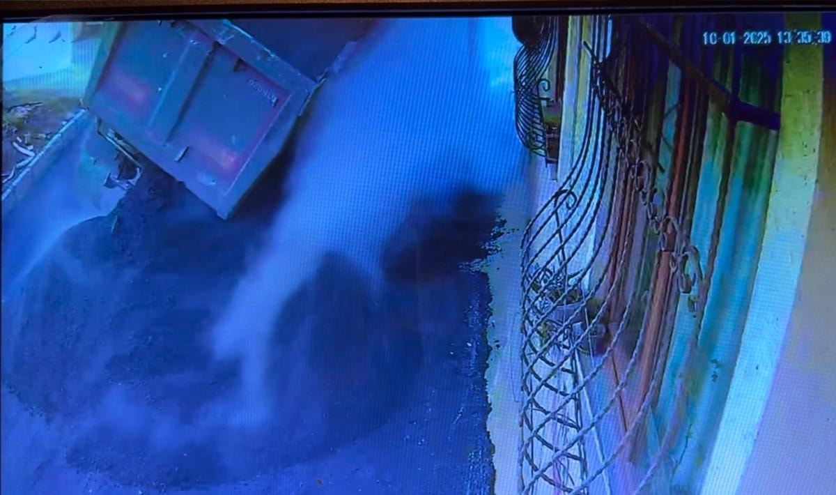 Damper devrildiği sırada kamyonun yanından geçerek binanın yan tarafına yürüyen bir kişi ise ölümden saniyelerle kurtuldu.