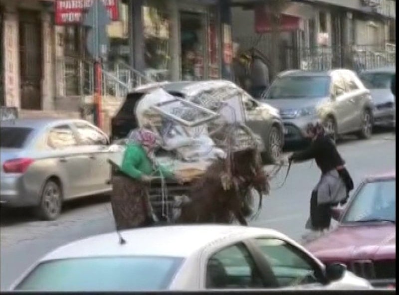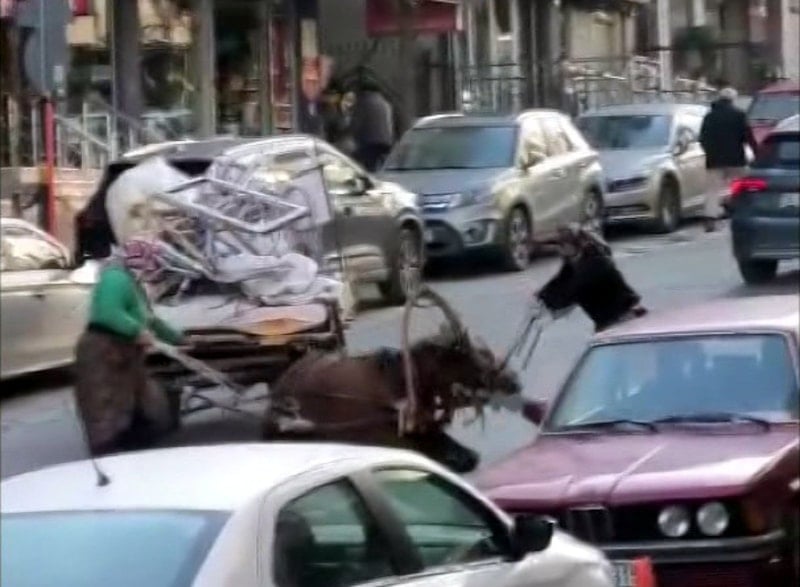 Avcılar'da sokaklardan geri dönüşüm malzemesi topladığı öğrenilen iki kişi, pencere, kapı ve çeşitli eşyalarla doldurdukları at arabasını ilerletmekte güçlük çekti.