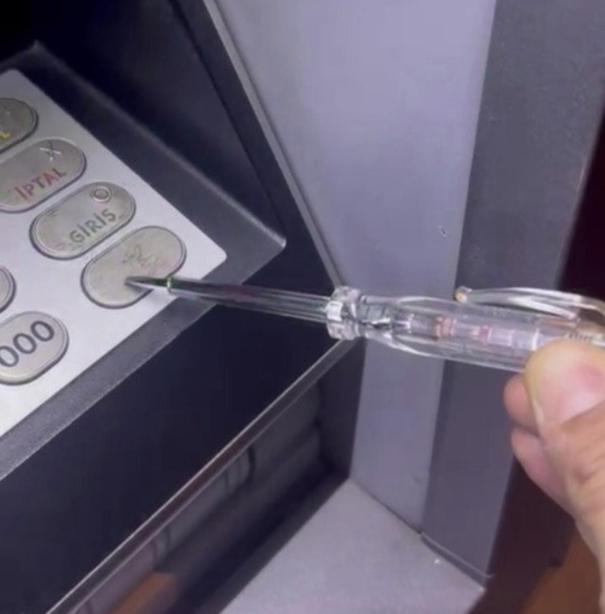 Ardından vatandaş, kontrol kalemiyle yaptığı incelemede ATM’de elektrik kaçağı olduğunu tespit etti.
