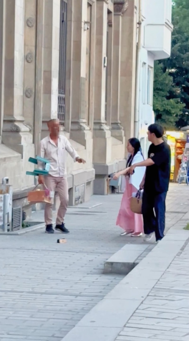Fırçayı alan boyacı çiftin ayakkabısını temizlemek istedi ancak turist çift yakayı zor kurtardı.