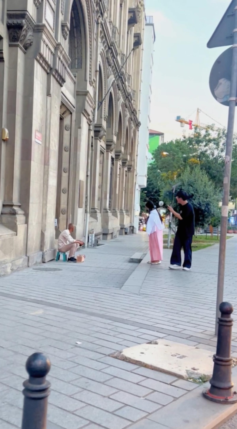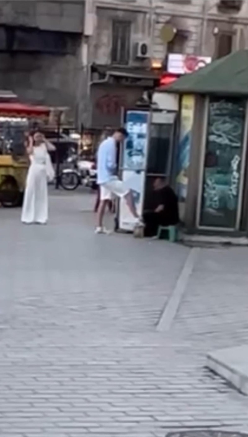 Ardından fırçayı alan boyacı, meydanda yürüyen çiftin peşine takılarak ayakkabısını temizlemek istedi.