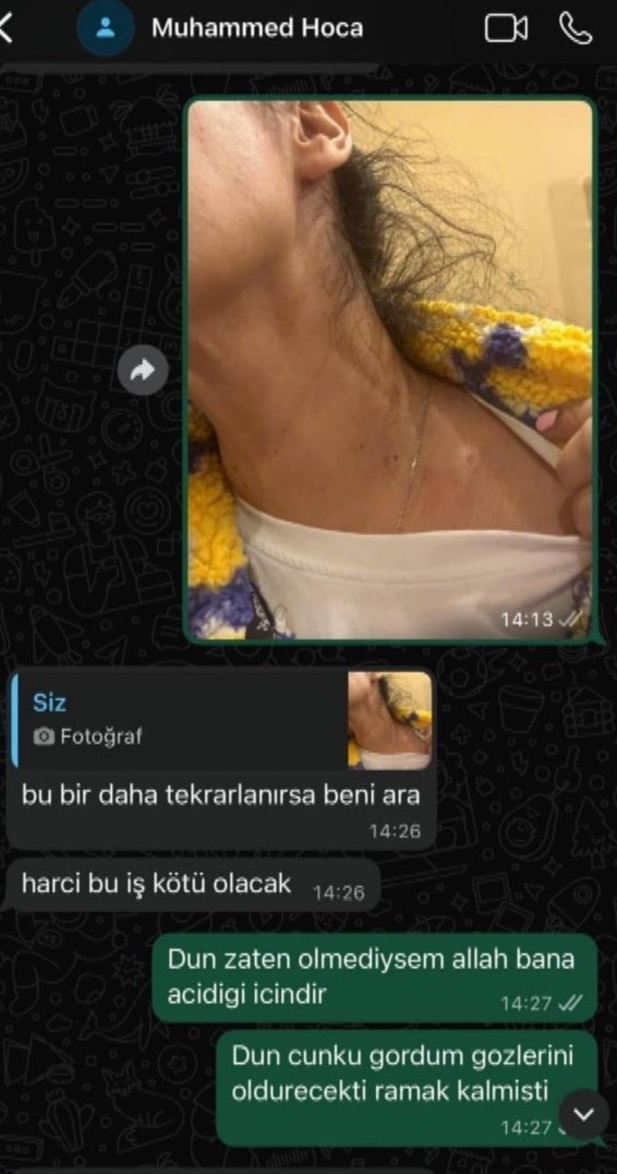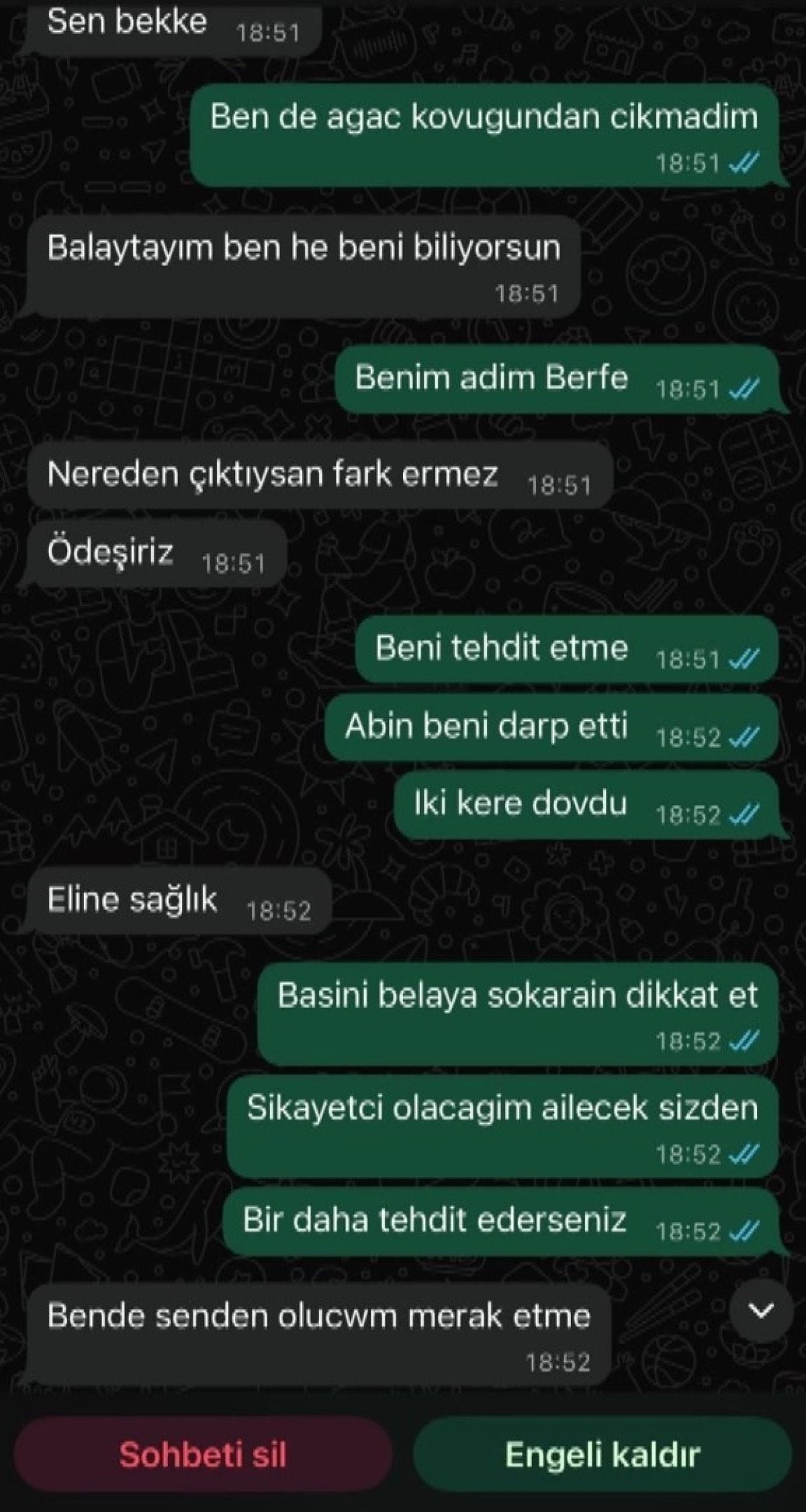 Beyefendi inatla arkadaşlarım üzerinden benimle iletişim kurmaya çalışıp şikayetlerimi geri almamı, aksi takdirde olayların çok daha kötü boyutlara gideceğini belirtiyor. Ben de hiçbir koşul ve şart altında şikayetlerimi geri almayacağımı söylüyorum.