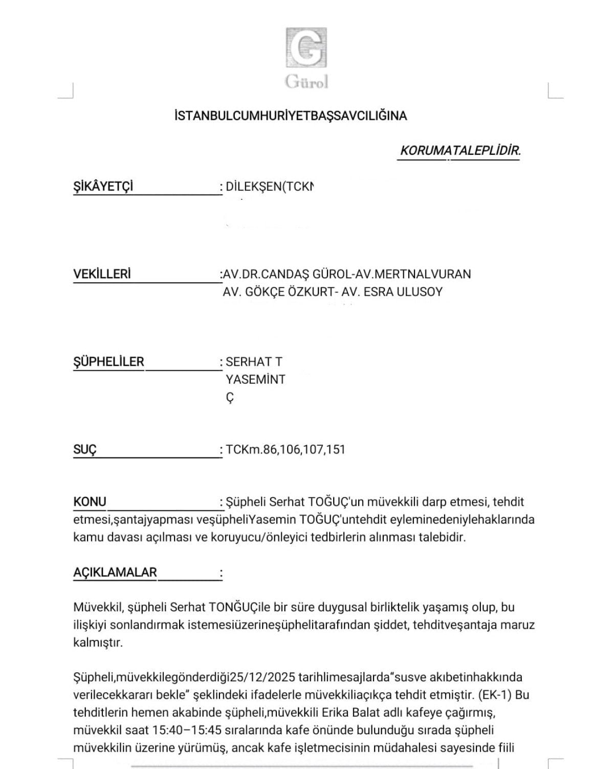 - Şen, Serhat T.'den darp raporu alarak şikayetçi oldu ve uzaklaştırma kararı çıkarttı fakat Serhat T. tarafından hala psikolojik şiddet görmeye devam etmekte.