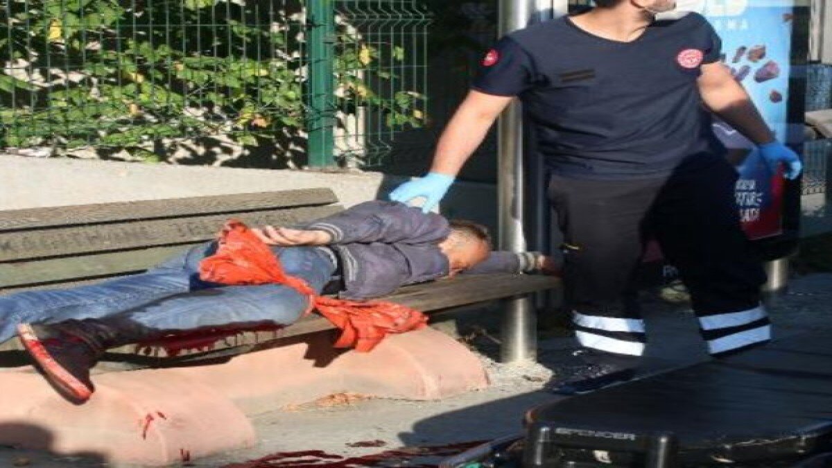 Bu halde yaklaşık 1 kilometre yürüdükten sonra aşırı kan kaybı nedeniyle gücü tükenen kişi, otobüs durağındaki banka yığıldı.