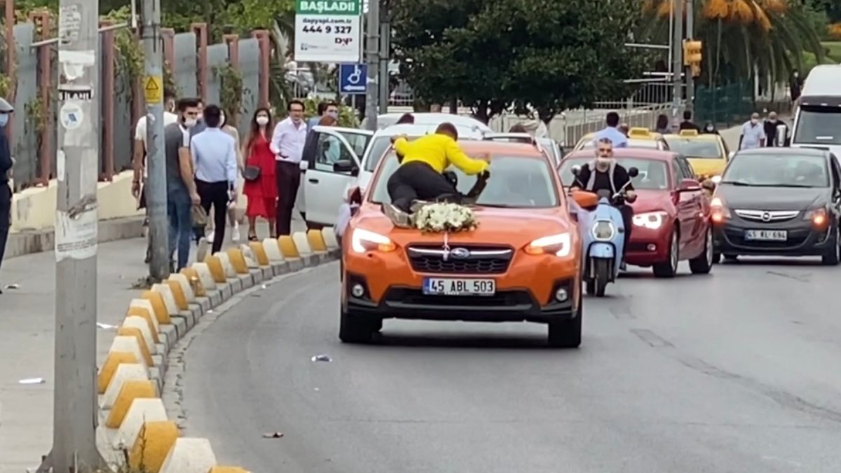 İstanbul’un Kadıköy ilçesindeki evlendirme dairesi önünde gelin arabalarının üzerlerine çıkarak bahşiş toplamaya çalışan, canlarını da tehlikeye atan gençler trafikte terör estirdi.