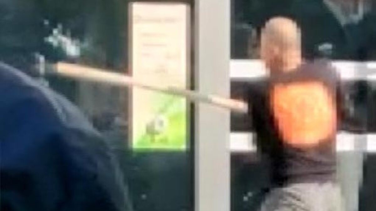 Banka şubesinin önüne elinde sopayla gelen şahıs, henüz bilinmeyen nedenle, bağırdıktan sonra sopayla bankanın camlarına vurmaya başladı.