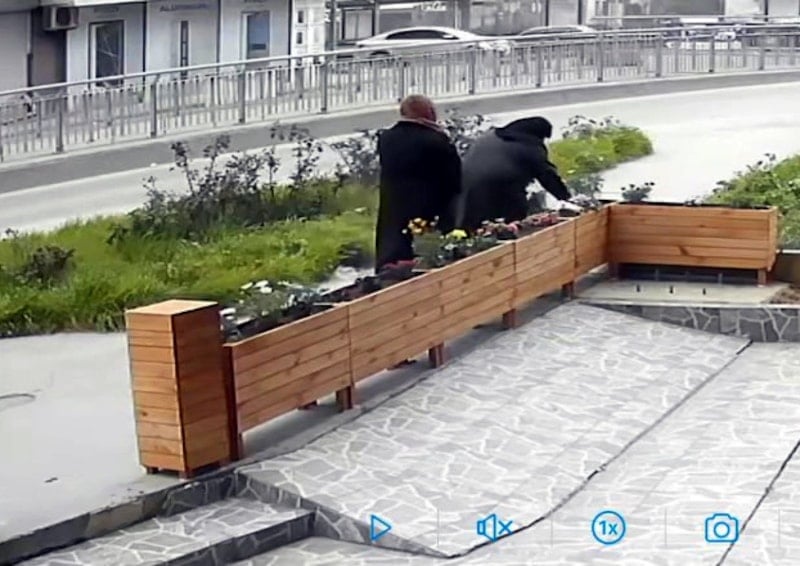 Biz de bir bakalım dedik. Bir burada bir de diğer uçtan çalınmış iki tane çiçek çalıyorlar. İki hanımefendi geliyor yaşları da büyük, torbanın içine atıyorlar. Kamerada göründüğü gibi gizli gizli arkalarına bakarak gidiyorlar. Ramazan ayında yapılan hoş değil.
