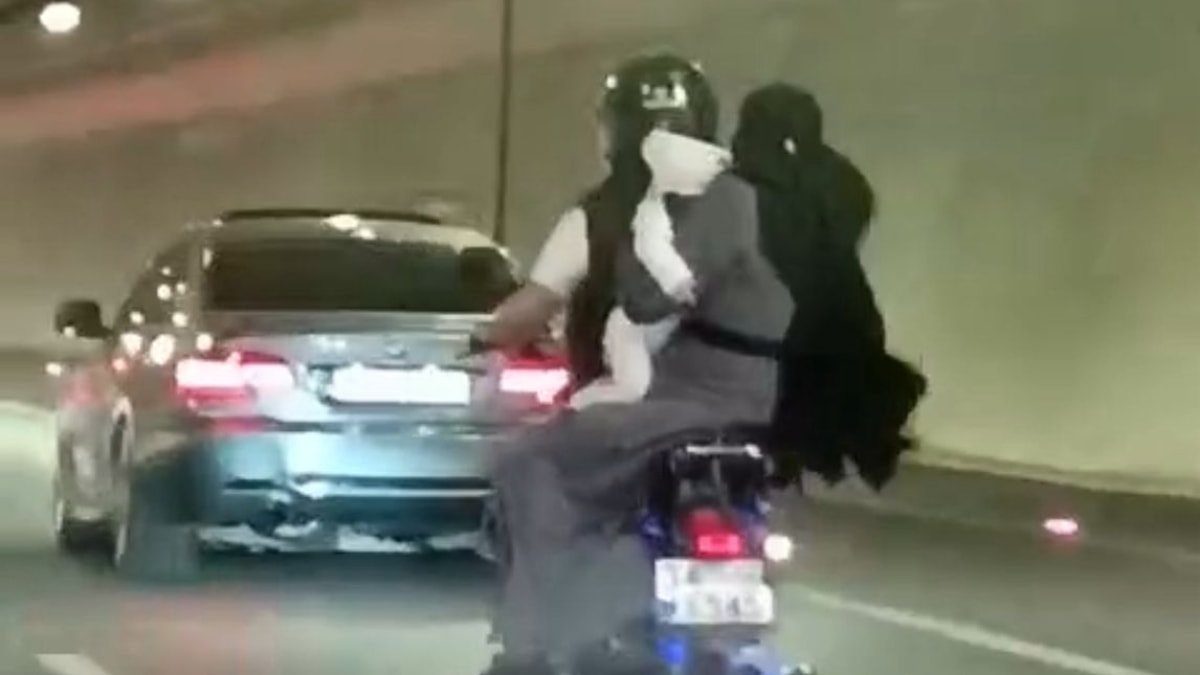 3 kişilik aile tünelde, hem kendi hayatlarını hem de trafiği tehlikeye attıktan sonra motosikletle gözden kayboldu.