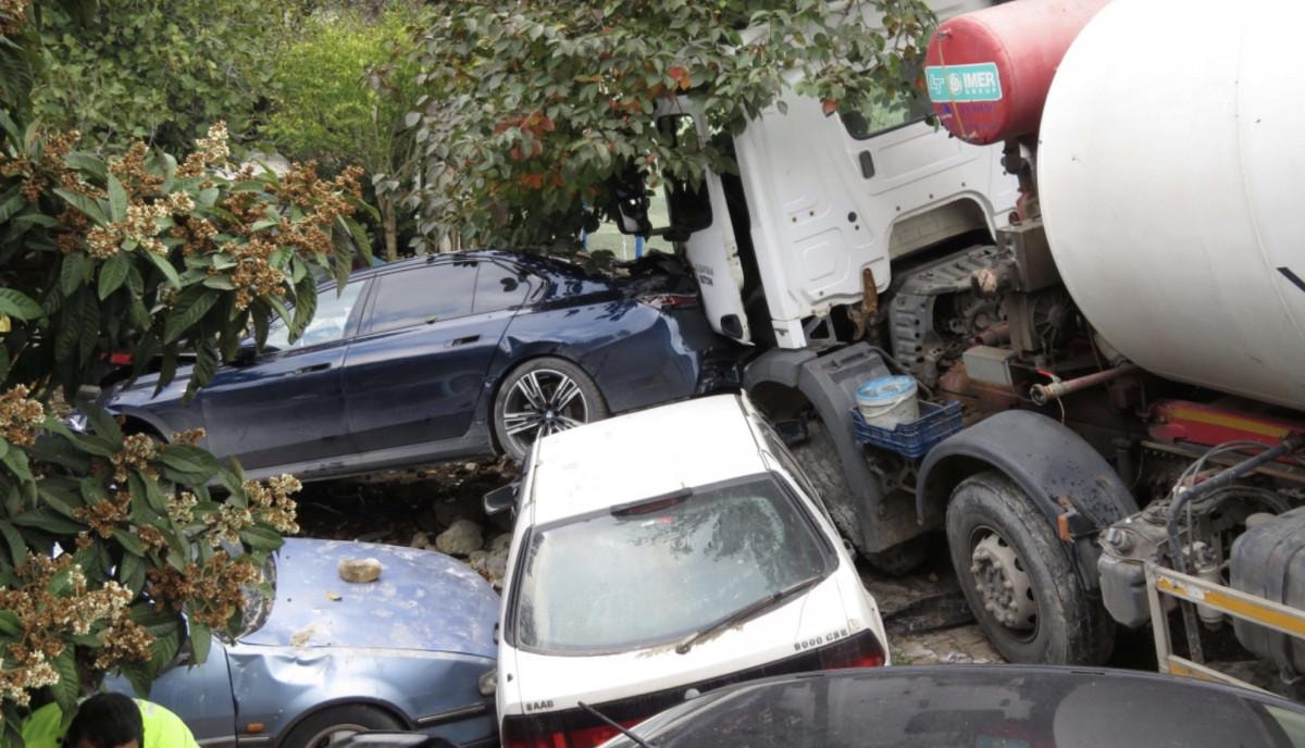 Park halindeki araçlara çarparak sürükleyen mikser, 7 aracı ezdi. Ardından beton mikser ağaca çarparak durabildi.
