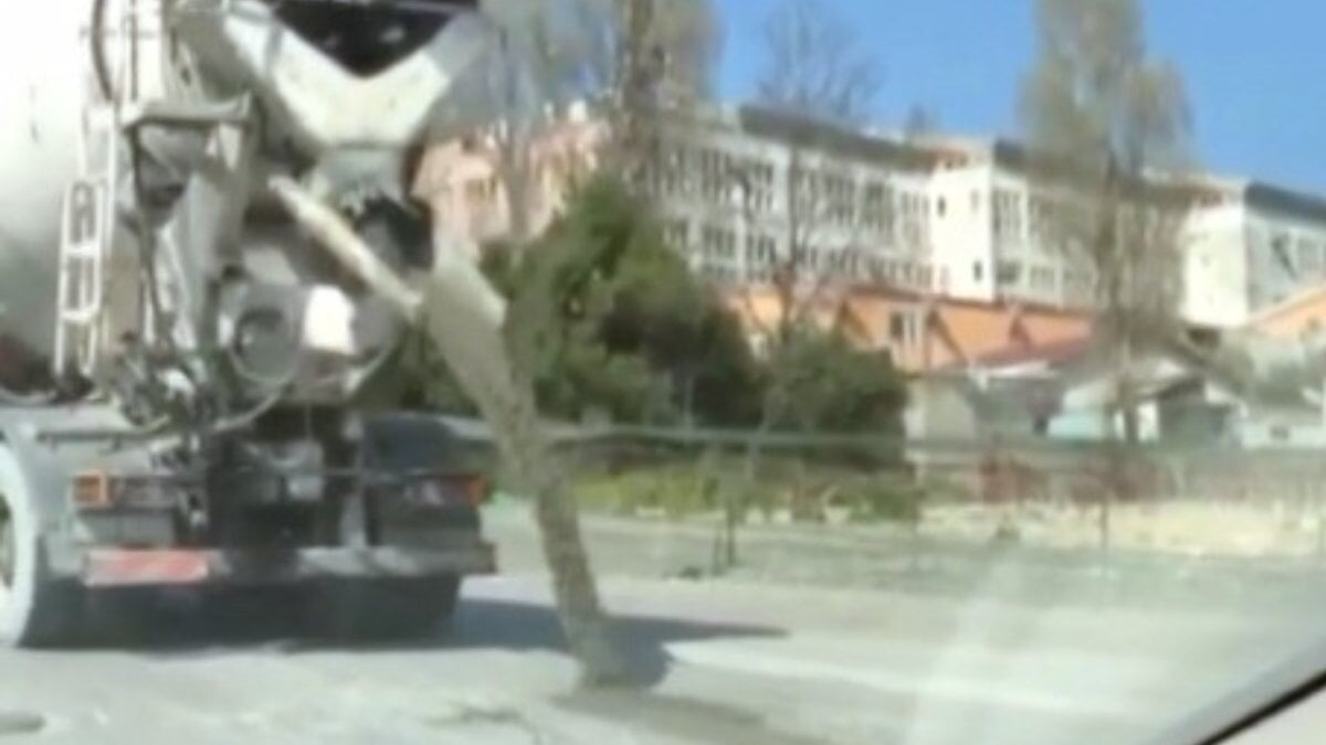 Beton mikserinden dökülen betonu metrelerce gittikten sonra fark eden sürücü araçtan inerek dökülen betona müdahale etti.