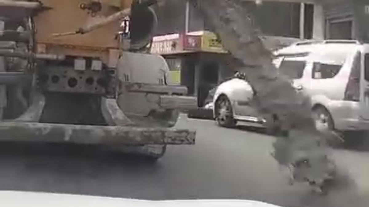 İstanbul Kağıthane'de dün öğle saatlerinde Merkez Mahallesi Kemerburgaz Caddesi'nde meydana gelen olayda, caddede seyir halinde olan beton mikseri sürücüsü, yola harç dökmeye başladı.