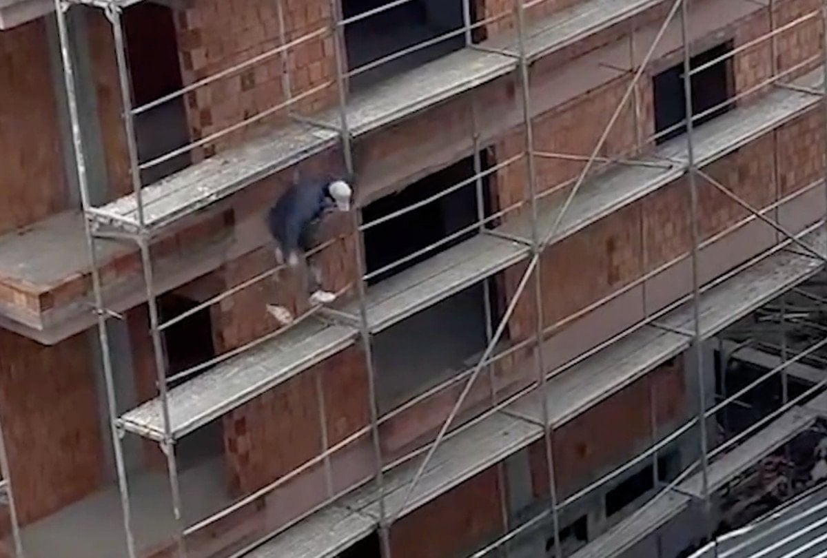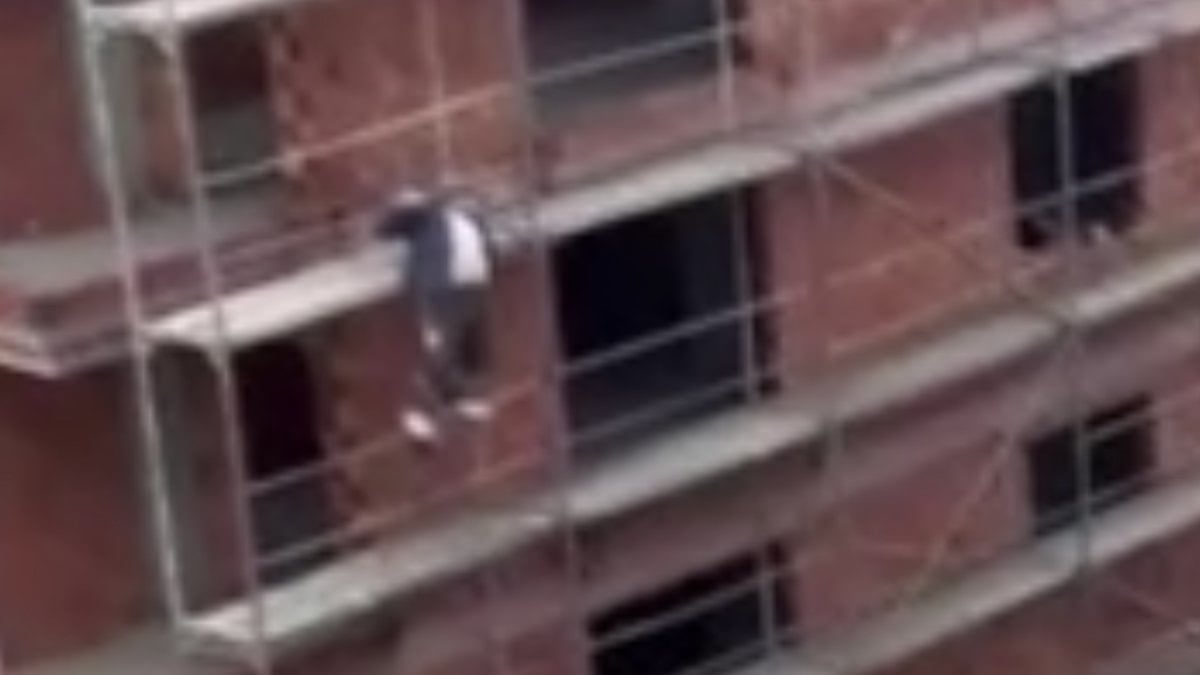 O esnada kardeşinin kavga ettiğini gören bir işçi, metrelerce yüksekte çalıştığı inşaat iskelesinden adeta örümcek adam gibi inerek kardeşinin yardımına koştu.