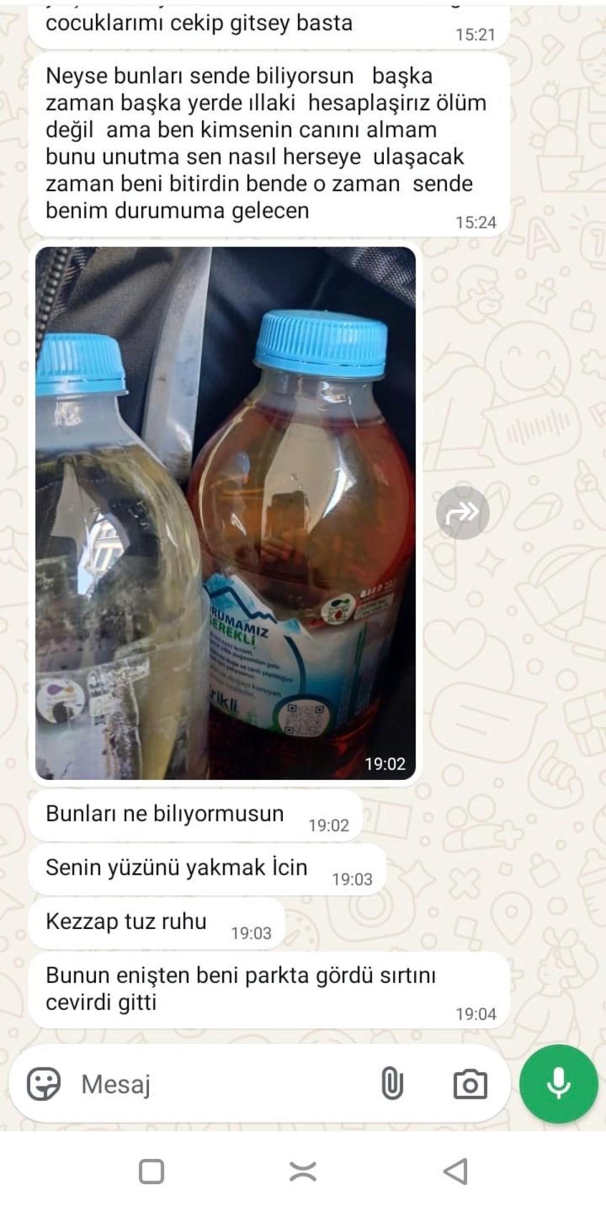 Ben ailemle yaşamaktayım. Bugün ailemin evine gelerek camda babamla konuşup onu oyalayıp dışarı çağırıyor. Babam ona güvenip dışarıya çıkmıyor. Babam dışarıya çıkmadığı için babamın yüzüne kezzap atıyor. Kız kardeşim siper oluyor o da kollarından yaralanıyor. Ben evde olsaydım o kezzap suyuyla benim yüzümü yakacaktı.