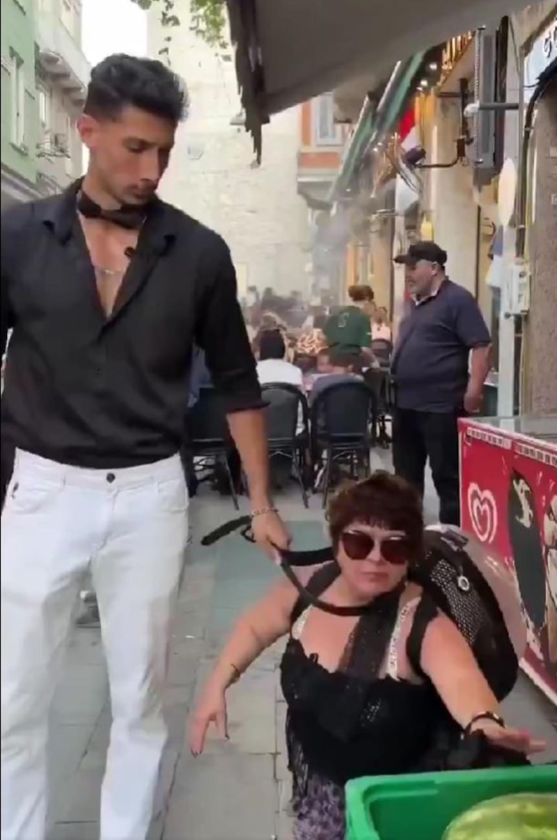 Genç bir adam yaşça kendisinden büyük bir kadını boynuna tasma takarak sokakta gezdirdi.
