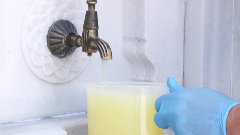 Limonata çeşmemiz bizim hemen arkamızda gördüğünüz gibi. Burada bizim çelik kazanımız vardır. Dışarıdan biz de limonatayı getiriyoruz. Tamamen saf ve doğaldır. Dondurulmuş vaziyette geliyor. Ve biz burada suyla onu açıp destekliyoruz. Ve bu şekilde de çeşmemize gönderip küçük bir hidrofor yardımıyla çeşmemize gönderip burada sürahiler yardımıyla masalarımıza dizdiğimiz bardakları doldurup vatandaşımız hizmetine veriyoruz. Tahmini 2 bin 500-3 bin bardak biz burada cuma günü limonata dağıtıyoruz.