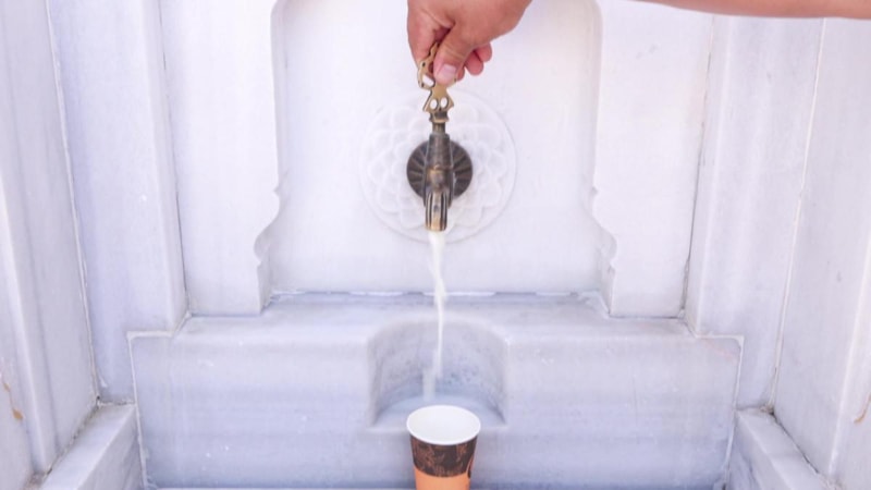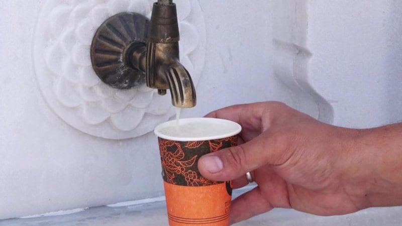 CAMİ ÖNÜNDEKİ ÇEŞMEDEN BARDAKLARA DOLDURULUYOR