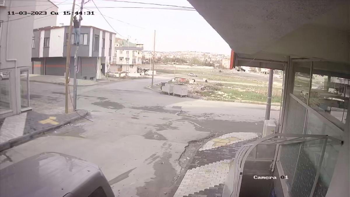 Şüpheli daha sonra kablonun diğer ucunu ise metrelerce yükseklikteki direğin üzerine çıkarak yanındaki bıçakla kesti.