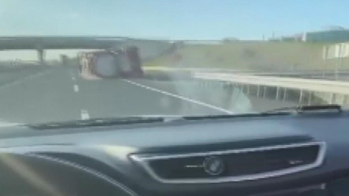 İstanbul’da, Kuzey Marmara Otoyolu Çatalca mevkiinde, saat 11.00 sıralarında, tepecik istikametine giden karayoluna bağlanmak isteyen tır, virajı alamayarak devrildi.
