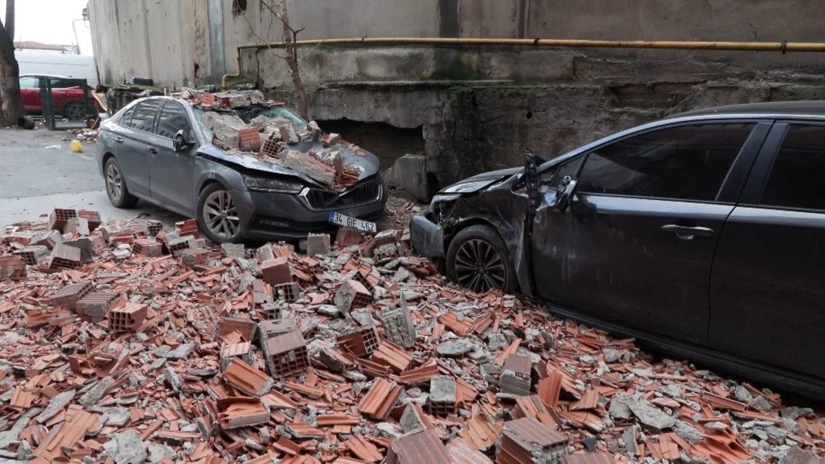 - İstanbul Eyüpsultan'da yıkım aşamasında olan ve bağlantı noktaları kesilen bir binanın duvarı, fırtınanın etkisiyle park halindeki araçların üzerine çöktü.